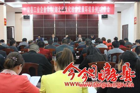 今日房县网讯 记者 高书文 通讯员 吴泽萍 李雪丽 报道: 16日,县经信局组织全县66家重点规模以上工业企业负责人,学习《湖北省优化经济发展环境条例》并召开座谈会,向企业详细解读《湖北省优化经济发展环境条例》和2014年涉企乱收费专项治理等工作的实施方案,并听取和收集企业负责人对县政务服务工作的建议和意见。县政府党组成员、招商局局长李相明出席会议。