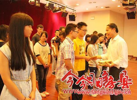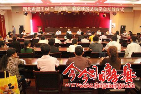 今日房县网讯 记者陈绍杰报道: 30日,湖北希望工程“十五助”喻友旺房县助学金发放仪式在霖泓会议中心举行。省“慈善之星”、新八建设集团有限公司党委副书记喻友旺现场向我县33名贫困大学新生捐资10万元善款。省青少年发展基金会秘书长张奕一行,团市委书记蒋科,县委副书记张慧彬,县人大常委会副主任丁宪章,副县长林华出席发放仪式。张慧彬主持会议。