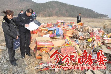 当日下午3时许,5辆货车驶进县东城工业园区某空地,持有《焰火燃放作业人员现场操作证》的工作人员将车上依法收缴的非法烟花爆竹产品卸下并分类堆放,在经过最后一次安全检查后,现场工作人员撤离到安全距离以外,随着现场指挥员的引爆命令,这批非法烟花爆竹产品被集中销毁。据县安监局局长李勇介绍,这批产品主要是2014年8月份“六打六治”打非治违专项行动开展以来,特别是全市信访维稳安全工作会议以后,县安监、公安、工商等部门在部分非法储存点、烟花爆竹经营点以及无证经营点依法收缴的非法烟花爆竹产品。此次共销毁烟花3000箱,鞭炮1500挂。