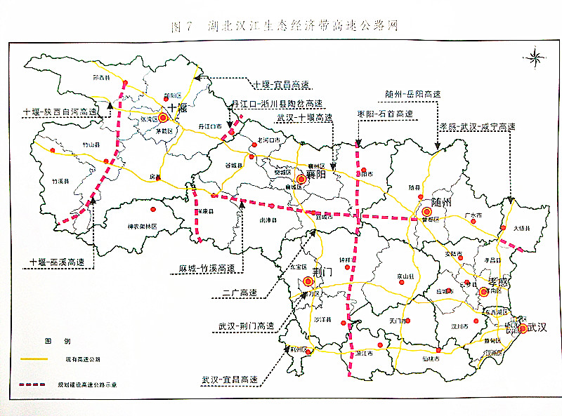 在湖北汉江生态经济带开放开发总体规划中,汉江生态经济带将完善高速公路体系,建成十堰—宜昌、枣阳—石首高速公路,尽快完成区域内高速公路“六纵四横”布局,实现高速公路辐射区域内所有县级以上城市。