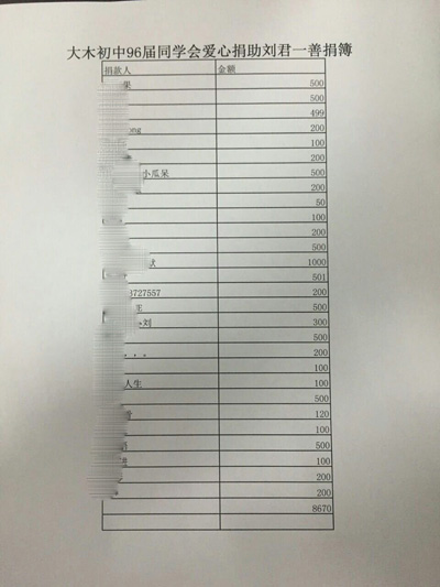 刘丽珠和刘君一的小姨冯娟为1996届大木初中同学,在冯娟将小君一的患病信息发在同学群内后,已经毕业20年的同学们反响强烈,纷纷表示愿尽绵薄之力帮助小君一。在大家的建议下,刘丽珠设置微信收款码,对捐款进行登记汇总和公布。截至22日捐款关闭,共收到群内28人计9070元捐款。