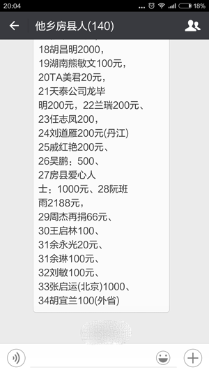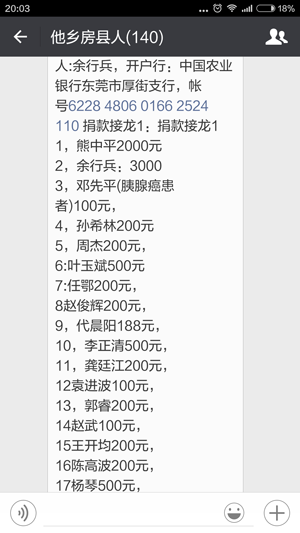 22日,群内开始爱心捐款活动。余行兵率先捐了3000元,副会长熊中平捐了2000元。逐渐,群内老乡受到爱心感染,你五百我两百的通过微信转账或者微信红包将钱转给余行平。随着群友们相互转发和呼吁,不少身在北京、上海等地的房县人也加入进来,捐款从四面八方涌来。