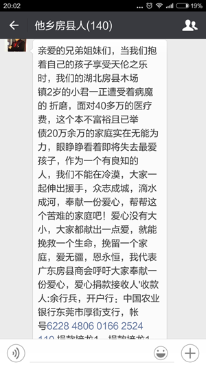 21日,房县广东商会会长余行兵在群内看到群友转发的消息,通过房县媒体核实信息真实性后,当晚10时许,余行兵在群内发出为刘君一捐款的倡议(如文章开头),并设立了专门的善款银行账号。