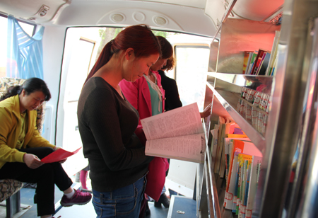流动图书车为群众免费提供图书借阅