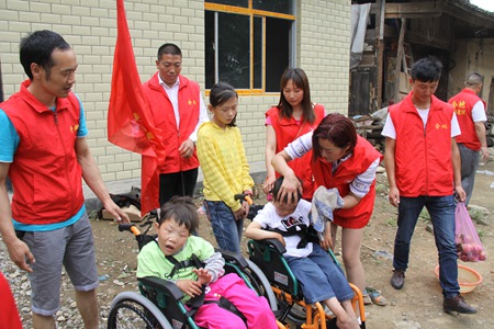 当天上午,房县大爱义工、房县金地家居建材中心助残服务分队、房县残疾人培训中心的爱心志愿者们还来到城关镇炳公村陈永榜家献爱心。陈永榜今年82岁,双目失明,儿子在外打工,收入微薄,儿媳妇出走五年,杳无音讯,两个10多岁的孙子、孙女患有脑瘫,生活不能自理,一家三个残疾人全靠70多岁的老伴照顾,虽然国家为他们盖起了新房,办了低保,但生活仍十分困难。爱心志愿者为两个脑瘫孩子送来了轮椅,并现场为他们清洗,换上了捐赠的新衣服,同时为陈老汉家捐赠了水果、食用油、大米等。金地家居建材中心总经理柴长胜表示,他们会继续履行企业社会责任,为陈永榜家提供必要的帮助。