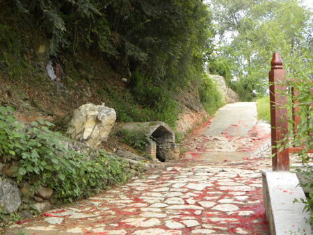 现在,古井里清水平齐路面,井旁有一巨大的青石,形似蛤蟆蹲在井旁。水井后边的崖壁石龛之中,新上任的“龙王爷”神态庄重地注视着过往的游客。