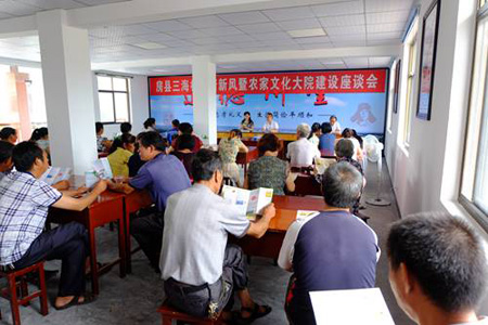 农家文化大院是房县农村精神文明建设品牌、助力精准扶贫的内生动力工程。5月起,我县启动三海示范点工程。此工程以县委提出的“忠孝礼义信简俭平顺和”十字主流价值观为主线,重点围绕文体广场、文化墙、农家书屋、道德讲堂、志愿服务站、身边榜样、家风廊、十星文明户、文化农家、乡规民约等十大文化项目,发动基层干部群众广泛参与,在人人参与、人人监督、人人共享中,一项一项抓落实。建成的文化大院相当于在群众生活的物质家园里,重建了一个精神家园、文化乐园,引导群众住在大院、建绿美大院,学在大院、建文明大院,乐在大院、建欢乐大院,富在大院、建幸福大院。