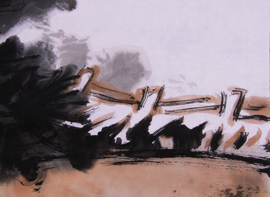 记者:到达房县的当天所作的松风水韵图看起来并不是房县的景色,采风后所作山晴图也是将挂榜岩、村舍、路边的柿子树抓取结合在一起,都不是实景?