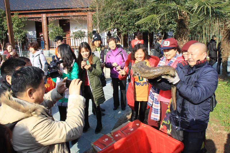 大鲵是我县八大产业之一,现已大量在室外训养,城关镇居民戢德宏看好野人谷优质水源和地理环境,在那里成立大鲵养殖专业合作社,野外养殖大鲵,取得成功,并有了以自己头像为基本元素的“鲵大福”品牌。他的展位前被挤得水泄不通,和“活化石”大鲵合影的游客应接不暇,不时要抓起十几斤重的大鲵“摆范儿”,弄得他满头大汗。