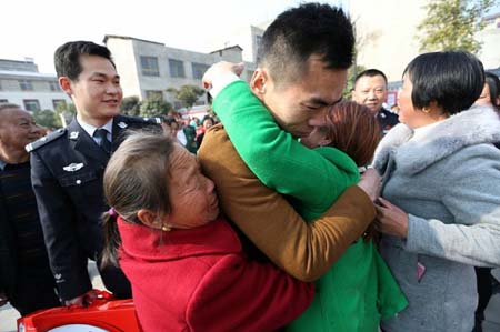 在市、县民警的陪同下,杜明明与上茅坪村村民任冬生、张桂云夫妇见面。他跪在地上,刚说了一句“爸爸,妈妈,儿子回来了”,就泣不成声。“儿啊,我们对不起你!”任冬生和张桂云拉起杜明明,抱着哭成一团。