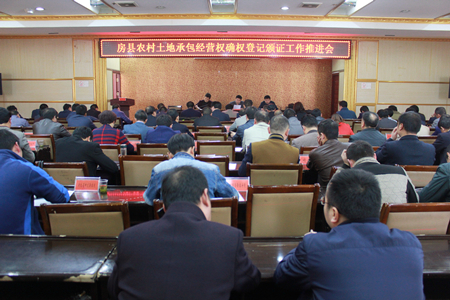 今日房县网讯 记者陈绍杰 通讯员吴鹏报道: 1日,我县召开农村土地承包经营权确权登记颁证工作推进会,会议通报了近阶段全县土地确权登记颁证工作的进展情况,对下一步工作进行再安排部署。副县长董诠闻,各乡镇、县直相关单位负责人出席会议。
