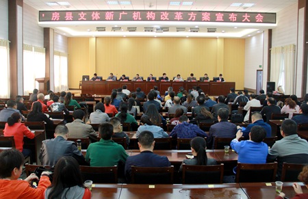 今日房县网讯 记者刘臣 报道:4月27日,房县召开文体新广机构改革方案宣布大会,对县文体局、广电局合并及县广播电视台独立等具体改革工作进行安排部署。县委常委、宣传部长高勇,副县长冉瑶函出席会议。