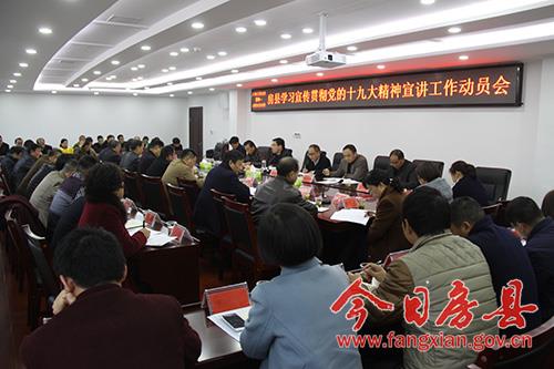 今日房县网讯 记者杨珩 报道:20日,我县召开学习宣传贯彻党的十九大精神宣讲工作动员会,并组建“一团九队”将赴全县各地,开展十九大精神宣传。县委常委、宣传部长高勇出席会议。