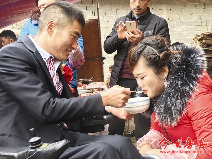 今日房县网讯 十堰日报记者李平 报道:2月9日,房县沙河乡沙河店村二组一个农家院落里热闹非凡,来自四川达州,省内襄阳、十堰的众多网友涌入这里,参加见证高位截瘫小伙雷泽军的婚礼。网友中有多名高位截瘫者,还有多名残疾人,有人几天前就打车来到小雷家帮忙布置新房、料理婚事。新娘名叫田静,来自山西省长治市屯留县上村镇上村。他们结缘于网络,雷泽军在“快手直播”上成“网红”,田静成了他的粉丝。田静千里迢迢来到房县大山深处看望他,两人一见钟情。最终,田静带着全部家当再次来到这里,他们组建了一个幸福的家庭。