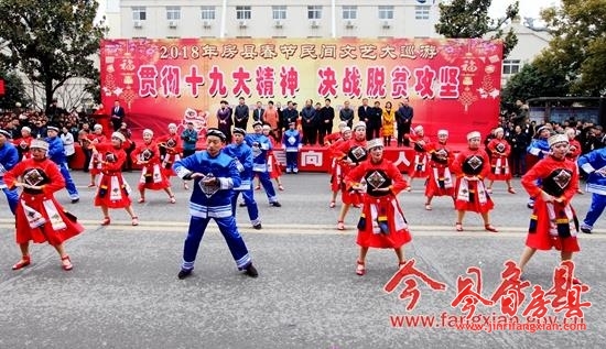 龙腾狮跃歌盛世,政通人和闹元宵。正月十三民间文艺大巡游,这项房县春节生活必不可少的重要文化活动,继承了流传千年的传统习俗,同时也被赋予了新的时代内涵。“贯彻十九大精神·决胜脱贫攻坚”,本次正月十三民间文艺大巡游以民间民俗文艺展演的形式,充分展示了我县取得的发展成就和人民群众的美好生活,也为房县发展建设进一步凝聚士气、鼓舞干劲,吹响脱贫攻坚决战决胜号角。