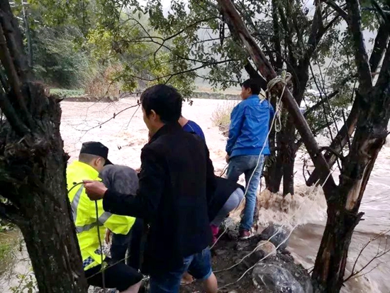 此时,湍急的河水还在不断上涨……采取人工渡河的方式救援肯定不可取,救援人员试着改变方案。根据现场情况,救援人员决定用绳索绑上石块扔到对岸,把被困者拉过来,确定了抛投地点后,救援人员成功将绳索抛向对岸。