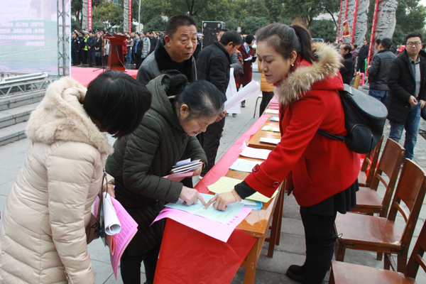 工作人员向群众发放宣传资料
