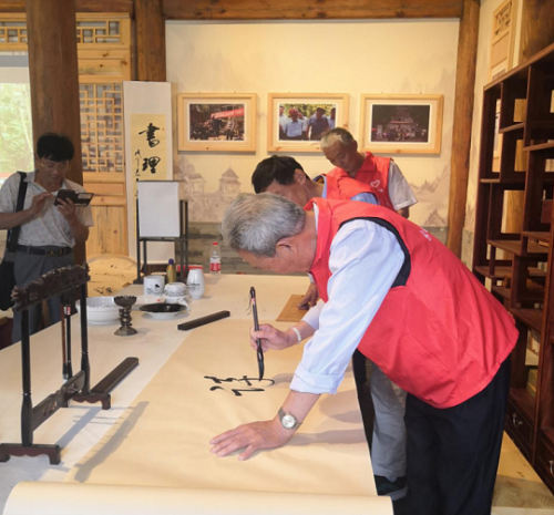 首站到达读书人的圣殿供奉尹吉甫的宝堂寺,古寺面貌焕然一新,青砖灰瓦,雕梁画栋,石碑伫立,诗文赫然碑上,伴随着诗经继承人龚文友老师的生动讲解,志愿者们满怀着对传统文化的崇敬,摇头吟诵《诗经》,挥毫颂扬诗经,徜徉在古诗的海洋和对中国国学的膜拜中。