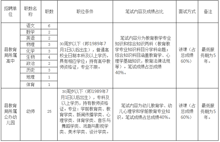 根据《事业单位人事管理条例》(国务院令第652号)、《事业单位公开招聘人员暂行规定》(人事部令第6号)、《关于转发中组部、人社部关于进一步做好艰苦边远地区县乡事业单位公开招聘工作的通知的通知》(鄂人社函〔2017〕220号)、《关于进一步规范全省事业单位公开招聘工作的若干意见》(鄂人社发〔2016〕23号)等文件精神,经县委、县政府同意,决定面向社会公开招聘高中和幼儿教师59名,其中:高中教师34名、公办幼儿园25名(含村级幼儿园)。现将有关事项公告如下:
