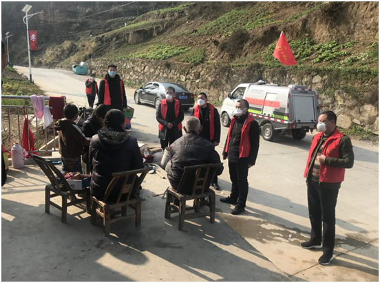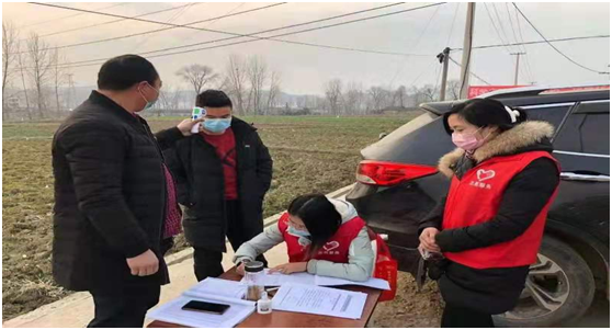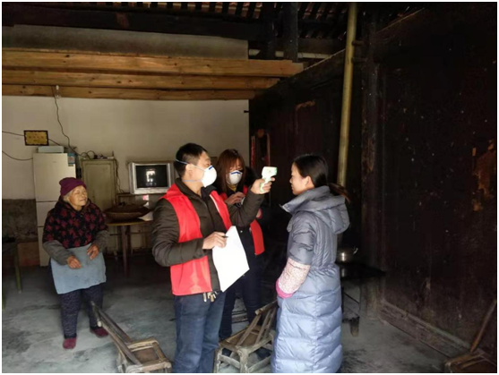 房县红塔镇五将村志愿者主动担负起把守路口、为村民义务测量体温的工作。