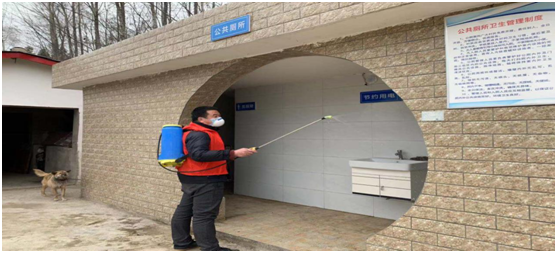 志愿者义务为公共场所消毒。