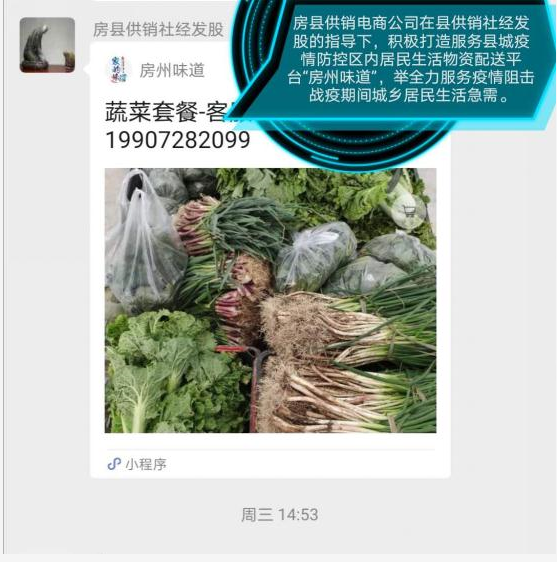 与此同时,针对当前疫情防控阻击战时需要,全县大街小巷、各交通路口通行管制,小区封行,居民居家阻断疫情蔓延防控等措施,由此带来的一系列生活不便,县供销电商.怡嘉商贸公司及时顺应态势,打造城区居民生活急需物资配送平台“房州味道”,涵盖100多个有规范物业管理的小区,居民通过扫码进入自已所在的小区平台,在平台上下单订购,提交后由公司负责配送到小区卡口,由小区值勤值守人员负责送到户主家门口。