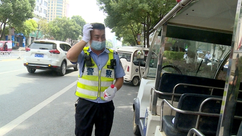 高温天气下的道路交通安全形势更为严峻,行人不走人行道、电瓶车抢占道路的现象频发。在站岗亭、十字路口,交警们及时劝导行人、非机动车遵守交通法规文明通行。有11年工作经验的交警李俊涛通过镜头提醒市民:现在天气比较炎热,开车一定要记好安全带,驾驶摩托车、电动车请一定带好安全头盔,行人过斑马线一定要看人行横道红绿灯,不要横穿马路、翻越护栏,机动车在斑马线要主动避让行人,请大家都遵守交通规则、安全文明出行。
