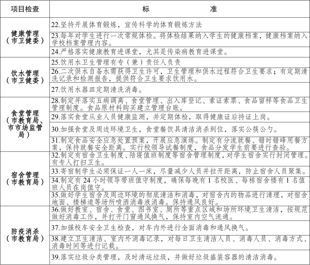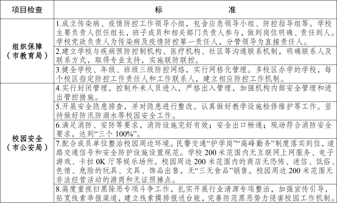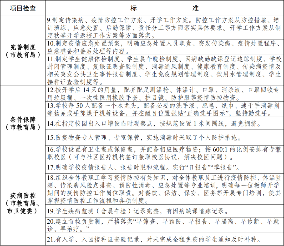 (一)严格要求。各地要严格按照中央和省、市有关要求认真开展评估验收,条件不达标,坚决不开学,切实保障师生生命安全和身体健康。各检查组要在各地疫情防控指挥部评估验收基础上,针对薄弱环节开展针对性抽查,切实为秋季开学学校(幼儿园)把好疫情防控和安全关。