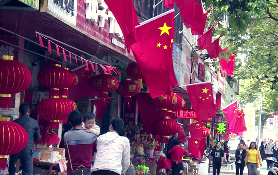 “满眼一片红色,不仅节日气氛浓了大家的爱国情也跟着浓了。”