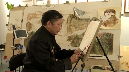 许光建说:“今天是中秋节,也是我们伟大祖国的生日,我今天画这幅烙画,祝福我们的祖国繁荣昌盛 ,我们的好日子蒸蒸日上。”