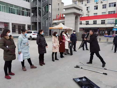 保安人员及宿管员在认真听取灭火器使用方法及操作要点