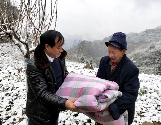 观音沟村驻村工作队队员杨荣军为五保送去棉被
