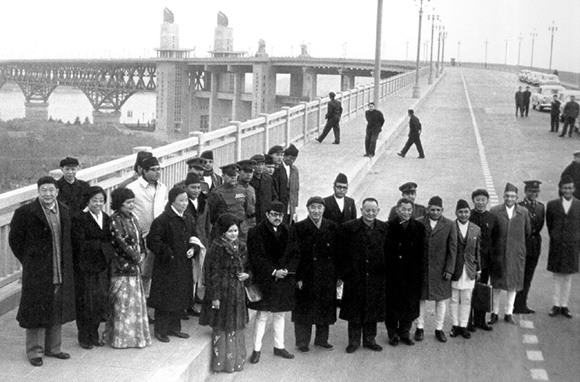 1973年12月,徐向前(前排左三)陪同尼泊尔国王和王后参观南京长江大桥