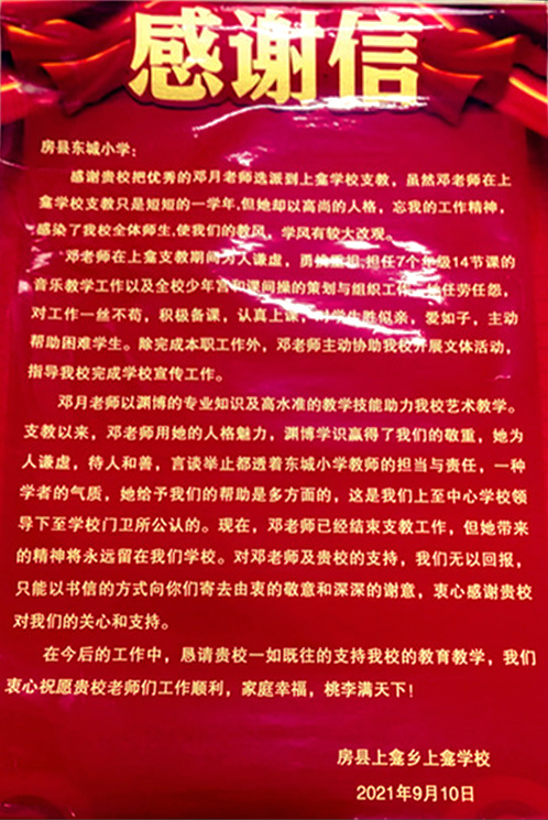 今日房县网讯 通讯员 李英 冀曼 戢敏 报道:“非常感谢贵校把这么优秀的教师选派到我校支教!更为房县东城小学能培养出这般富有爱心与责任心的老师而感到由衷的敬佩!”近日,房县东城小学收到一封来自房县上龛乡上龛学校的感谢信。一封感谢信,道出了上龛学校对该校派遣的支教教师邓月老师工作成绩的肯定和浓浓的谢意。