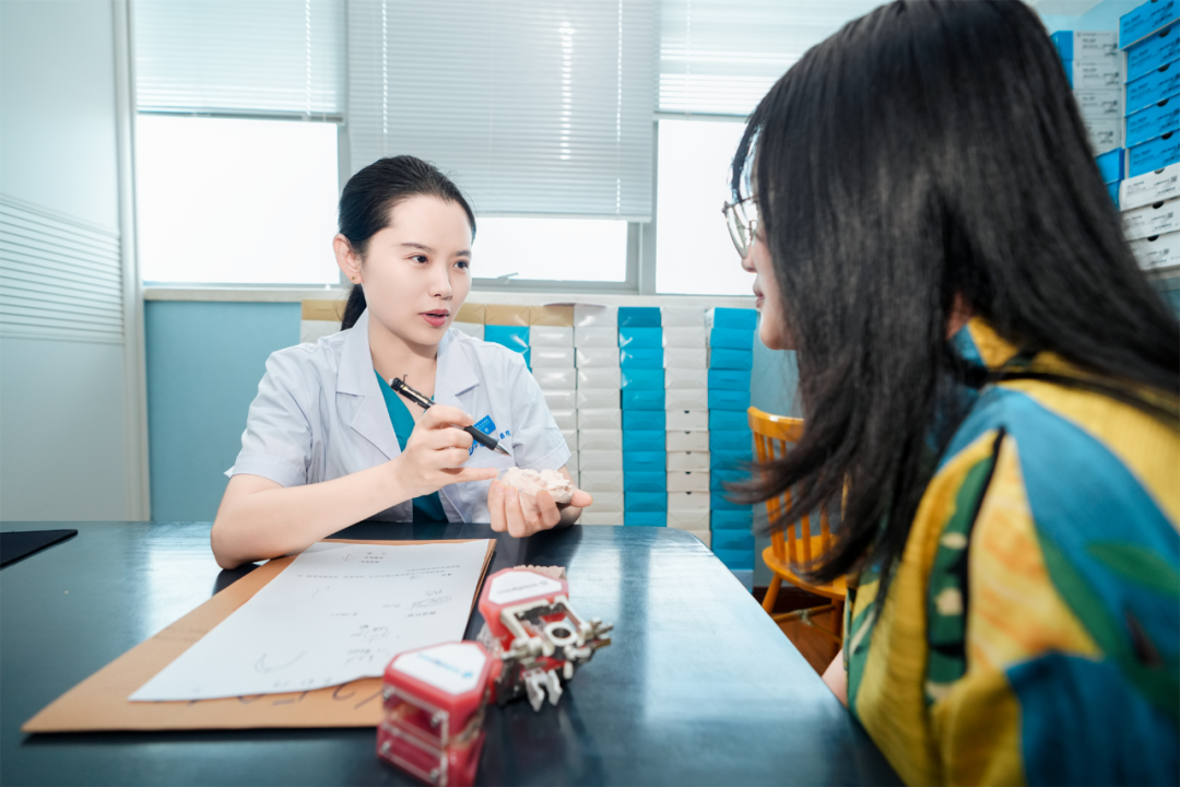 医生设计完成后,当天经过3D打印,小黄就佩戴上了专属矫治器,过程很轻松。于曼主任为她详细交代了注意事项,刚戴上牙套会出现一些不适感,比如牙齿酸软,这些都是正常现象,症状会逐渐缓解。
