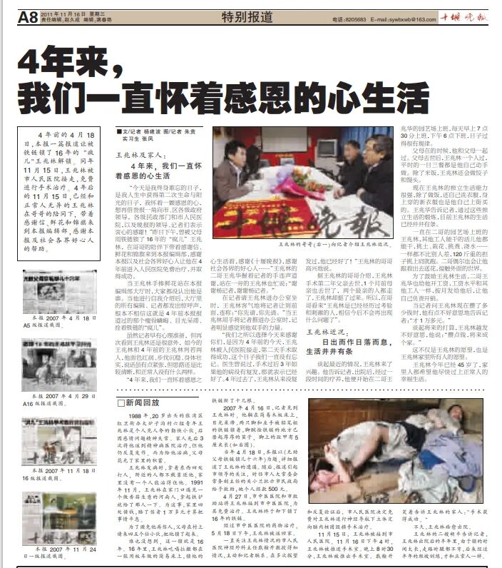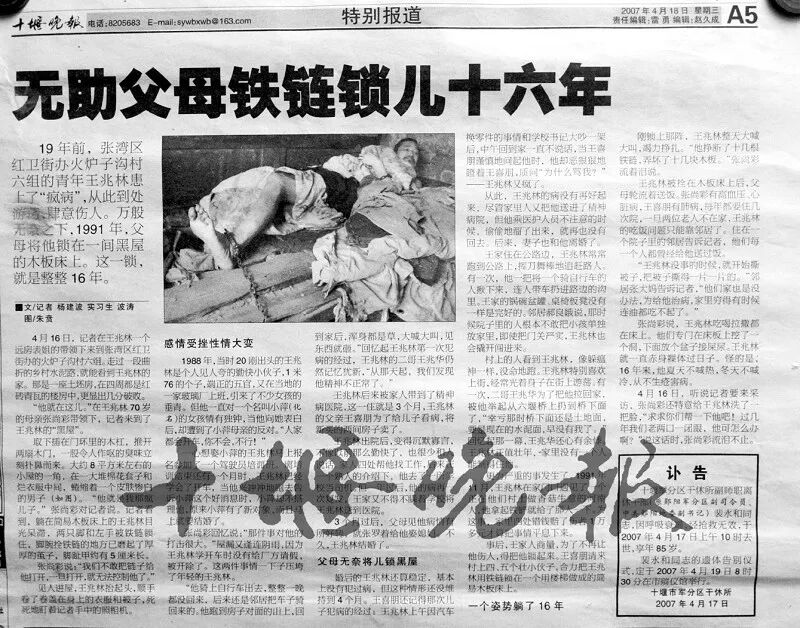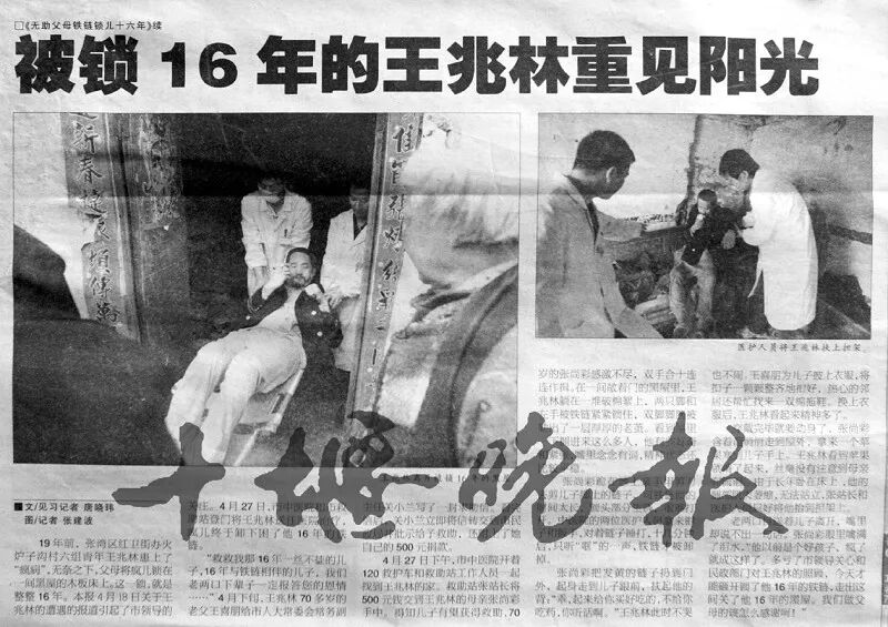 2007年4月18日,十堰晚报以《无助父母铁链锁儿十六年》为题报道此事,王兆林的遭遇引起广大市民关注。