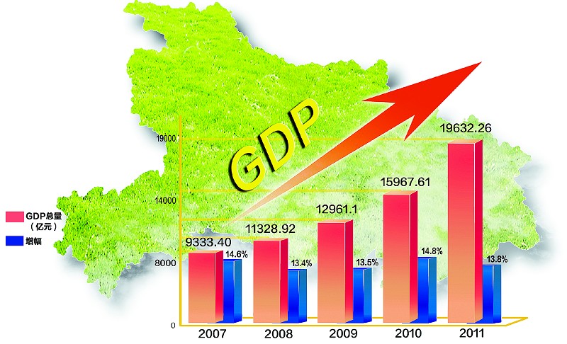 从2007年的9333.40亿元,到2011年的19632.26亿元。5年来,我省GDP年均增速为14%。